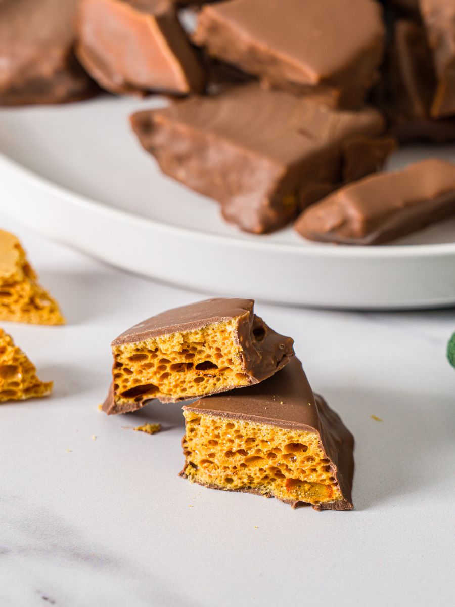 Crunchy, airy, golden honeycomb candy coated in chocolate. It shatters when you bite into it and somehow melts instantly.