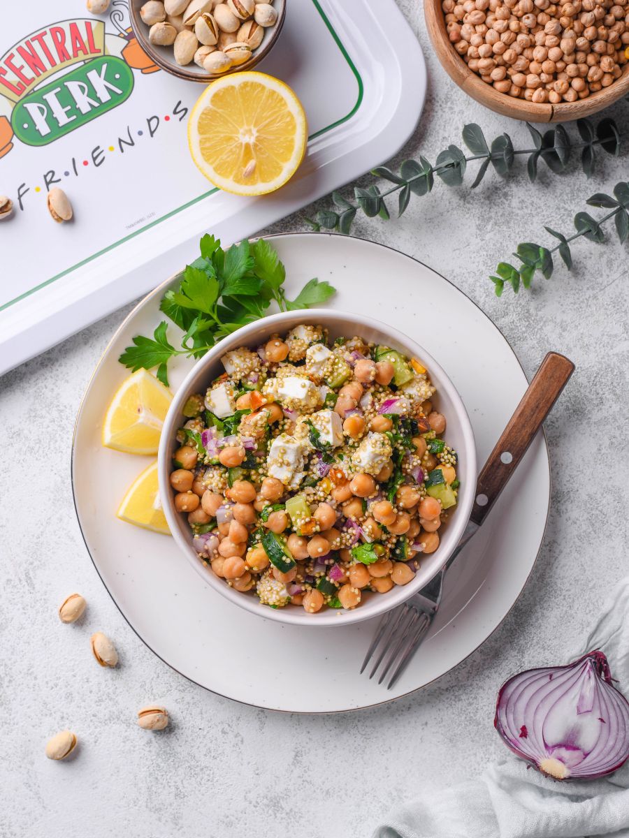 Quinoa, chickpeas, cucumber, herbs, feta — bright, crunchy, fresh.