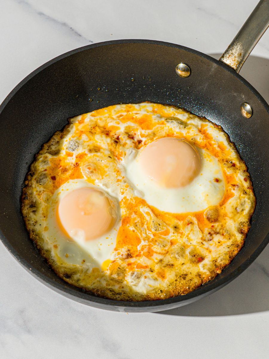 Fried or jammy eggs topped with chili flakes and a drizzle of hot honey; sweet, spicy, and rich all at once.